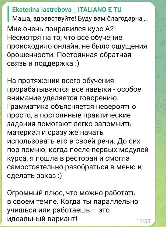 Хочу выразить благодарность моему первому онлайн-преподавателю итальянского языка Екатерине! Наконец-то пройден первый уровень изучения А1. За это время мы много узнали, прошли теорию и увлекательную практику. Хочу отметить очень интересные, креативные домашние задания и обратную связь с Екатериной в любое время суток. Очень радует наличие устных заданий, направленных на развитие навыков говорения и понимания на слух итальянской речи. Очень довольна этим курсом и счастлива, что переходим на новый уровень. Уверена, что под чутким руководством Екатерины мы уверенно овладеем этим прекрасным языком.