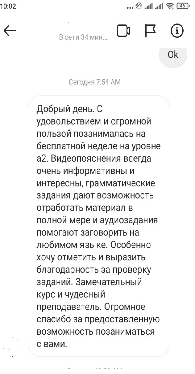 Не думала, что занимаясь онлайн, можно достигнуть какого-либо прогресса. Однако, вопреки моим опасениям, занятия оказались эффективнее, чем я ожидала.